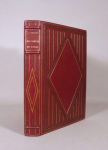 Les Contes du Lundi. Paris, Les Éditions d'art Devambez, 1928. In-4, maroquin grenat, décoré de pièces mosaïquées olive et brun estampées à froid, filets verticaux dorés entrecoupés, losange central à encadrement doré, encadrement intérieur orné d'un double filet doré et de pièces mosaïquées olive et brun, doublure et gardes de soie pourpre, dos orné de même, tête dorée, couverture et dos, étui (Flammarion). Édition ornée de 14 eaux-fortes hors texte originales au repérage par Pierre Brissaud.