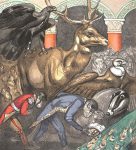 Le Roman de Renard. Paris, Éditions Vialetay, 1958. 2 parties en un volume in-folio, vélin ivoire illustré d'un médaillon représentant un renard peint à l'aquarelle et signé JS, dos lisse, guirlande intérieure dorée, doublure et gardes de moire jaune, tête dorée, non rogné, couverture et dos, étui (E. Valenta). Première édition illustrée de 90 compositions de Paul Jouve gravées sur bois par Jacques, Camille et Georges Beltrand, dont 2 en noir pour les couvertures et 88 en couleurs.