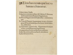 [1567]. (MEDICINA). GALENO: [OPERA QUANDEM NUNC RECENS INVENTA AC LATINATATE DONATA]. [Caesaroagusta: apud Antonium Furnium, 1567] Falto de la portada. 8° mayor. 3 h. + 327 p., 25 h. Enc. en plena piel, cortes pintados. Palau 96677.