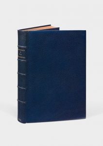 Le Tiers Livre des faits et dicts héroïques du bon Pantagruel. Paris, Société des Amis des livres, 1933. In-4, maroquin bleu janséniste, tranches dorées, doublure de maroquin lavallière, gardes de moire bleu nuit, couverture et dos, étui (Devauchelle). Édition ornée de 112 illustrations en couleurs de l'affichiste André Lapuszewoki, sous le pseudonyme J. Stall.