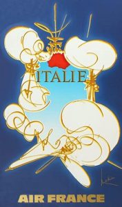 Lot de 12 affiches publicitaires d'Air France. Paris, Air France, imprimeries Pietrini Bastard Fouqueray, [1967]. 12 affiches, chacune de 1 m x 60 cm, sous pochettes plastifiées, large étui de bois. Affiches réalisées en 1967 par le peintre Georges Mathieu à la demande d'Air France pour une campagne publicitaire. Ces affiches représentent certains symboles connus de chaque pays illustré : Italie – Amérique du Sud – Égypte – Japan – Grande-Bretagne – Allemagne – Inde – France – Canada – Israël – Mexico – Spain.