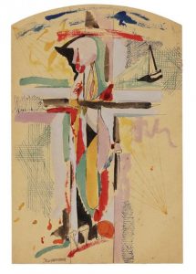 La première œuvre figurant une descente de Croix est signée du monogramme S.D. et titrée en bas à l'encre Jesuoberkemph. La seconde, à l'encre et au pastel représente une forme abstraite multicolore.