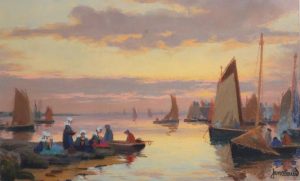 Le Retour de la pêche. 21 x 33,5 cm, sous marie-louise, cadre moderne. Pastel sur papier d'un port au moment du coucher du soleil, sans doute à Concarneau.