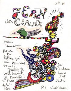 Les lettres sont ornées de décalcomanies, gommettes et d’ornements avec jeux sur les lettres, à l’encre et au crayon de couleurs. Certaines lettres sont écrites sur des pages de dessins déjà imprimés.