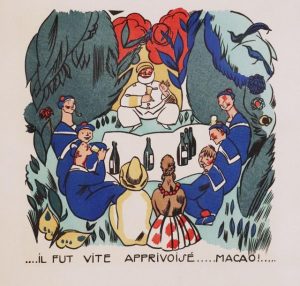 Macao et Cosmage ou L'Expérience du bonheur. Paris, Nouvelle Revue Française, 1919. In-folio, cartonnage illustré de l'éditeur. Édition originale de ce conte philosophique pour enfants, richement illustré au pochoir par Edy Legrand et entièrement colorié à la main par Jean Saudé.