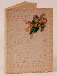 Œillades ciselées en branche. Paris, Éditions Jeanne Bucher, 1939. In-32, broché, plats recouverts de dentelle de papier et sur le premier plat, une reproduction contrecollée d'un angelot en couleurs dans l'angle supérieur droit, étui à rabats rose et crème (Julie Nadot). Édition originale illustrée de 25 compositions en couleurs de Hans Bellmer (1902-1975) reproduites en héliogravure dont le frontispice et 6 à pleine page.