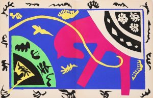 Jazz. Paris, Tériade, 1947. In-folio, en feuilles, couverture, chemise de l’éditeur. Édition originale de l'un des plus beaux livres illustrés de tous les temps, ornée de vingt planches en couleurs exécutées au pochoir d’après les collages et sur les découpages d’Henri Matisse : cinq à pleine page, quinze sur double page et douze ornements en noir.