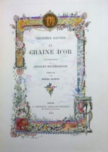 La Chaîne d'or. Paris, A. Ferroud, 1896. In-4, maroquin rouge, large bordure ornée de fleurons et feuillages stylisés au filet cernée d'un triple encadrement et d'un filet pointillé, rectangle central contenant un motif de chaîne dans le coin supérieur et gauche et, au centre du premier plat, un monogramme couronné doré, dos orné, double filet sur les coupes, bordure intérieure décorée d'une chaîne dorée avec fleurettes d'angles, couverture, tranches dorées (S. David). Édition préfacée par Marcel Schwob et illustrée de 16 gravures dans le texte de Georges Rochegrosse aquarellées à la main.
