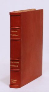 Les Soupers de Daphné. Paris, Éryx, 1951. In-4, maroquin orangé, guirlande intérieure dorée, doublure et gardes de moire jaune, tête dorée, non rogné, couverture et dos, étui (E. Valenta). Édition illustrée de 16 eaux-fortes originales d'Édouard Chimot.