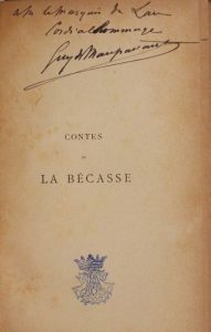 Contes de la bécasse. Paris, Ed. Rouveyre et G. Blond, 1883. In-12, bradel percaline brune, dos lisse orné d'un fleuron doré, pièce de titre noire (Pierson). Édition originale, dont il n'a pas été tiré de grand papier.