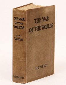 The War of the Worlds. Londres, William Heinemann, 1898. In-12, bradel toile grise, titre et nom de l'auteur en noir, non rogné (Reliure de l'éditeur). Édition originale de La Guerre des mondes.