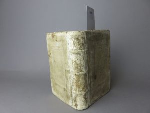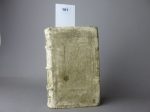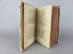 représentant le Christ sur la croix ; tranches rouges, papier chiffon écru. Petits défauts divers sur les plats, épidermure au dos, petite galerie de vers sur les deux premiers feuillets blancs et sur la garde collée. Vraisemblablement une reliure allemande ou hollandaise du XVIIIème, les derniers à réaliser des reliures en tout point conforme à celles réalisées au XVIème. Collationné et complet : 13 ff.n.c dont titre.- 436 pp. – 4 ff. n.c.