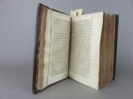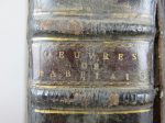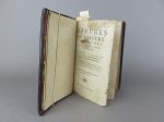 Sans imprimeur ni lieu, 1626. 1 volume petit in-8°, reliure d’époque en plein veau noir, filets à froid en encadrement sur les plats, dos à nerfs soulignés de filets dorés, pièce de titre de maroquin bordeaux. Frottements d’usage, petites épidermures, mors du premier plat fendu sur sa longueur, coiffe supérieure abimée avec petit manque de cuir dans le coin droit du caisson. Feuilles de garde changées fin XIXème. Collationné et complet. Pagination des plus fantaisistes. Collation sur les signatures des cahiers. 546 feuillets (1092 pages), l’exemplaire se termine sur un demi-cahier YYY IIII. Chaque livre (5) comporte une page de titre comprise dans la pagination. Gravure sur bois en frontispice de la page de titre du troisième cahier représentant le portrait de Rabelais. La page de titre de ce troisième cahier est abimée en marge avec manque de papier. Une petite mouillure en début de volume, papier fin et de petite qualité, quelques petites taches et rousseurs éparses. Vraisemblablement une contrefaçon des œuvres complètes, comme il y en eu beaucoup d’imprimées entre 1553, mort de Rabelais, et 1626, date de notre exemplaire. Cet exemplaire est en tout point conforme à celui numérisé et conservé à la bibliothèque de municipal de Lyon. Rare et toujours recherché.