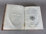 Aube Essai sur les principes du droit et de la morale. Paris, chez Brunet, 1743. 1 volume in-4°, reliure d’époque en plein veau, dos à nerfs orné, pièce de titre en basane fauve, plats aux armes ecclésiastique non identifiée, fleurs de lys...