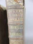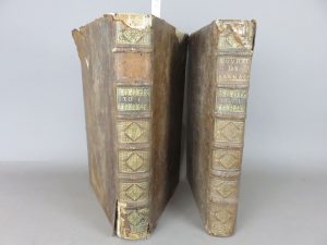 plein veau, dos à nerfs ornés de fleurons dorés, pièces de titre en basane brune, tomaison dorée. Reliure défraichie, manque pièce de titre du tome 1. Collation : tome 1 : 6 ff. non chiffrés-554 pp.-78 pp.-40 ff. n.c. / tome 2 : 2 ff.n.c.-507 pp.-35 ff.n.c.-4 ff.n.c.-124- 3 ff.n.c. Intérieur correct excepté une mouillure in-fine,. Vendu en l’état.