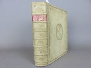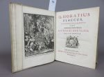 Horace Quintus Horatus Flaccus. Amstelaedami, chez Jacob Wetstenios & Guil. Smith, 1728. 1 volume in-4°, reliure d’époque en plein vélin rigide, guirlande dorée en encadrement sur les plats, marque dorée au centre des plats représentant un...