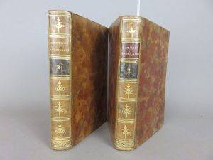 Boston et Paris, chez Buisson, 1788. 2 volumes in-8°, reliure très légèrement postérieure en plein veau porphyre, dos lisses avec fleurons, filets et titres dorés, pièce de tomaison en basane noire. Bon exemplaire avec de petits défauts sur les pièces de tomaison et sur deux coins. Manque la carte dépliante au tome 1. Exemplaire satisfaisant.