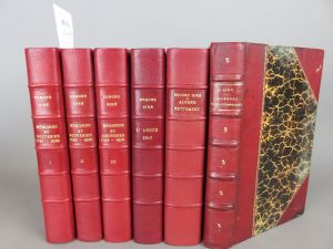 et titre dorés. Couvertures conservées. - L’année 1817, Paris Honoré Champion, 1895. 1 volume in-8° reliure identique aux précédents, couverture conservée et restaurée. - La presse royaliste de 1830 à 1852, Alfred Nettement sa vie et ses œuvres. Paris, chez Lecoffre, 1901. 1 volume in-8°, reliure identique. Couverture conservée, petites taches sur celle-ci, mouillure sur le portrait en frontispice. - Légendes révolutionnaires. Paris, chez Honoré Champion, 1893. 1 volume in-8°, reliure d’époque en demi-chagrin bordeaux à coins, dos à nerfs avec auteur, titre et fleurons dorés. Exemplaire enrichi d’une LAS de l’auteur avec son enveloppe, adressée à Albert Macé, rédacteur en chef du Courrier des Ardennes. Soit 6 volumes :