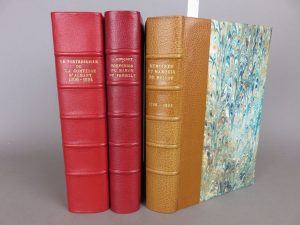 date dorés. Couvertures conservées légèrement défraichies, quelques piqures éparses. Bon exemplaire. On joint 2 volumes in-8°, reliure contemporaine en demi-chagrin rouge, dos à nerfs, titres dorés, couvertures conservées. Le premier ouvrage s’intitule : le portefeuille de la comtesse d’Albany 1806-1824. Paris, chez Fontemoing, 1902. Le second : Souvenirs du baron de Frénilly, Pair de France. Paris, chez Plon, 1909. Bon exemplaire.
