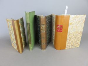 couverture conservée, mouillure angulaire sur les premiers feuillets. On joint 3 autres volumes concernant Louis XVIII, le premier : « manuscrit inédit de Louis XVIII précédé d’un examen de sa vie politique » par Martin d’Oisy. 1 volume in-8°, reliure d’époque en demi-basane marron, dos lisse, filets dorés à froid, titre doré. Légère décoloration de la basane. Portrait et fac-similé d’écriture en frontispice. Le second « Correspondance privée et inédite de Louis XVIII pendant son séjour en Angleterre ». Bruxelles, chez Tralier, 1830, in-8°, pleine percaline verte, pièce de titre en maroquin marron, piqures éparses. Le troisième « Description des cérémonies, fêtes, entrées solennelles et honneurs rendus à Louis XVIII en Angleterre et en France ». Paris, chez Schoell, 1814. 1 volume in-8°, reliure moderne, demi-basane fauve, dos lisse avec titre doré. Dos insolé.