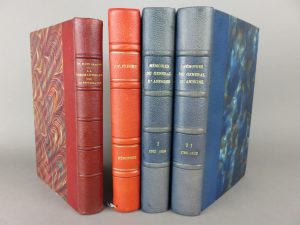 reliure moderne en demi-chagrin rouge, dos à nerfs avec auteur, titre et filets dorés. Dos insolé, couverture conservée. On joint 2 ouvrages en 3 volumes in-8° : le premier en 1 volume : « La presse littéraire sous la Restauration 1815-1830 » reliure d’époque en demi-chagrin rouge, dos à nerfs, auteur et titre dorés. Couverture conservée, envoi de l’auteur à Etienne Lamy de l’Académie Française. Le second en 2 volumes : Mémoires du général d’Andigné. Paris chez Plon, 1900. in-8°, reliure contemporaine en demi-chagrin bleu nuit, dos à nerfs avec titre et tomaison dorés, dos insolé, couvertures conservées, quelques piqures éparses.