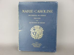Reiset (Marie-Antoine, vicomte de) Marie-Caroline Duchesse de Berry 1816-1830. Illustrations d’après les documents contemporains. Paris, Manzi Joyant & Cie, 1906. 1 fort volume in-4° broché, couverture rempliée, l’ensemble sous chemise et...