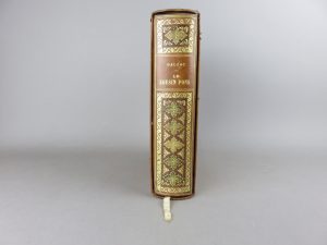 Balzac (Honoré de) Le cousin Pons. Paris, éditions littéraires de France, 1942. 1 volume in-4°, reliure en plein veau marron, décor et encadrement dorés, mosaïque sur les plats de petites feuilles vertes réalisées en maroquin. Dos lisse dans...
