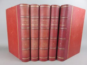 Buffon (Georges-Louis Leclerc de) Œuvres complètes de Buffon. Paris, Dufour Mulat et Boulanger libraires éditeurs, 1856. 5 volumes in-4°, reliure d’époque en demi-chagrin cerise, dos à nerfs avec filets dorés, filets à froid, titres et...