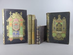 Collectif Ensemble de 5 cartonnages romantiques, circa 1850. 5 volumes en pleine percaline noire ou marron, 2 au format in-8° et 3 au format in-12, décor romantique polychrome sur les plats et au dos. - Faits mémorables de l’histoire...