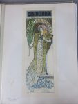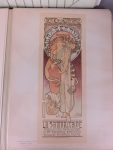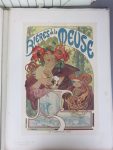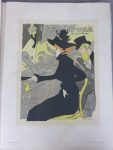 vignette en bistre dessiné par Jules Chéret. Petits défauts d’usage, quelques taches, lacets de fermeture en soie absents. Exemplaire un peu manié avec quelques planches portant des traces d’anciennes petites cornes en angle, serpentes souvent roussies, ainsi que certaines planches. Ensemble collationné comme suit : Premier portefeuille : 2 feuillets de souscription et 1 spécimen de la planche 210, puis les 12 premières livraisons en chemise ; ce premier volume est complet, soit 48 lithographies couleur, de 1 à 48 conforme à la table in-fine. Dans la première livraison il n’y a pas la prime offerte aux abonnés. Quelques rousseurs sur la planche de Toulouse Lautrec, moins sur la planche d’Alphonse Mucha. Rousseurs éparses, prononcées sur la livraison 11 dont la chemise est sale. Le second portefeuille contient : 12 livraisons allant de la n°13 à 24 et de la planche 49 à 96, complet des deux primes offertes aux abonnés ; ces primes sont roussies comme souvent. Ce volume n’a que très peu de rousseurs sur les planches de la chemise 17. Quelques piqûres demeurent ça et là. Les planches 82 et 94 à savoir Lautrec et Mucha sont propres. Le troisième portefeuille contient 12 livraisons allant du n°39 à 50 et de la planche 153 à 200. Complet des 4 primes offertes aux abonnés, rousseurs sur ces planches. Ce volume comporte des rousseurs et piqûres éparses en particulier sur les planches de la livraison 39. Les deux planches de Mucha (166 et 182) n’ont que de très petites piqûres en marge. Soit un total de 144 planches en chromolithographie couleur, sans compter les primes en noir, par les plus grands maîtres affichistes de tous les pays. Ce travail exceptionnel mené à bien par Jules Chéret a duré 5 ans de décembre 1895 à novembre 1900 et a permis la reproduction de 256 affiches réalisées par 97 artistes.