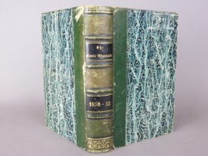 Cruikshank George The comic almanack and diary. London by David Bogue, Fleet street, 1850/1853. 1 volume in-12, reliure d’époque en demi-basane verte, dos à nerfs avec filets dorés, pièce de titre et de tomaison en basane noire. Usures...