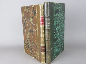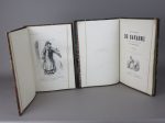 coins. Ce volume comporte 2 albums : le premier intitulé « la vie de jeune homme » contient 30 planches lithographiées en noir avec légende, le second intitulé « les débardeurs » contient 50 planches lithographiées en noir avec légende. Collationné sur la table des gravures, complet. Rares piqures sur certains feuillets. Petit trou dû à une brulure, de cigarette sans doute, sur la planche 13 du premier titre. On joint du même illustrateur, 1 volume in-8°, demi-basane marron à coins, dos à nerfs avec pièce de titre et date en maroquin rouge. Volume sans page de titre, publié par Hetzel à Paris, indication de date au dos, 1849. Ce volume contient 75 planches des « gens de Paris » album composé de différentes séries sur Paris. Lithographies en noir, très rares piqures. Soit 155 lithographies de Gavarni.
