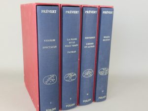 Prévert jacques - Folon Jean-Michel Œuvres. Paris, éditions André Sauret, 1982. 4 volumes in-4°, reliure pleine toile bleue de l’éditeur, dessin doré sur le premier plat, dos lisses avec auteur, titre et tomaison dorés, têtes dorées....