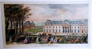 Veue du château de Meudon prise sur la hauteur de la grande allée vis à vis l’Orangerie. Gravure d’après J. Rigaud, tirée et coloriée vers 1820.