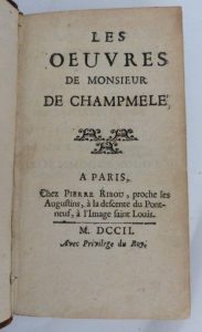 Les Œuvres. Paris, Pierre Ribou, 1702. In-12, veau fauve, dos à nerfs orné (Reliure du XVIIIe siècle). Réunion de 5 pièces de Champmeslé parues séparément chez Jean Ribou puis son fils Pierre, chacune pourvue d'une pagination et d'un titre particuliers, elles ont été réunies sous un titre général daté 1702 : Je vous prens sans verd (1699), Les Grisettes ou Crispin chevalier (1683), Délie (par Donneau de Vizé, 1668), La Rue Saint Denys (1682), Le Parisien (1683), Les Fragmens de Molière (par La Tuillerie, 1682).