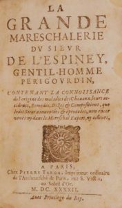 La Grande mareschalerie, contenant la connoissance de l'origine des maladies des chevaux, leurs accidents, remedes, dozes & compositions. Paris, Pierre Targa, 1642. In-8, vélin souple (Reliure de l'époque). Édition originale de ce rare recueil de remèdes hippiatriques.