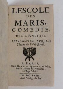 L'Escole des maris. Paris, Quinet, 1663. In-12, chagrin orangé, dos nerfs orné de caissons dorés, double filet dorè sur les plats, dentelle dorée intérieure, filet doré sur les coupes, tranches dorées (Krippel). Nouvelle émission de l'édition originale de 1661, à la date de 1663.