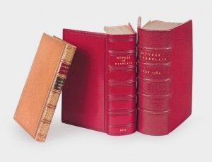 Œuvres. Contenant cinq livres, faicts, & dits heroiques de Gargantua et de son fils Pantagruel. Plus, la Prognostication Pantagrueline, avec l'oracle de la Dive Bacbuc & le mot de la Bouteille. Augmenté des Navigations & Isle Sonante. L'Isle des Apedefres. La Cresme Philosophale, avec une Epistre Limosine, & deux autres Epistres à deux Vieilles de différentes mœurs. Lyon, Jean Martin, 1584. In-16 ,de 402 pp. ch., 5 ff. n. ch., 576 pp. ch., 6ff. n.ch., 210 pp., 19 ff., maroquin rouge janséniste, dos à nerfs, dentelle intérieure, tranches dorées (Thibaron). Dans cette édition, le Cinquième livre est identique à celui de l’édition de Pierre Estiard de 1573, mais il est augmenté des Epistres à deux vieilles qui paraissent pour la première fois en 1584 à la suite des œuvres de Rabelais. Ces deux pièces sont de François Habert d’Issoudun ; elles avaient paru en 1551, dans la seconde édition des Sermons satyriques du sentencieux poete Horace, donnés par ce poète chez Michel Fezandat. L’une d’elles paraphrase la XIIe épode d’Horace Ad anum libidinosam.