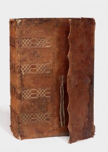 Livre de comptes vierge. [Lyon, XVIIIe siècle]. Grand in-folio (54 x 40 cm), basane fauve à large rabat, champ entièrement orné de fers, filets, roulettes et grand médaillons estampés à froid, quatre faux-nerfs surjetés se poursuivant sur les plats décorés d'entrelacs de lanières de parchemin, tranches lisses, inscription à l'encre noire sur la tranche de tête, traces d'attaches (Reliure de l'époque). Impressionnante reliure en basane estampée recouvrant un livre de comptes demeuré vierge.