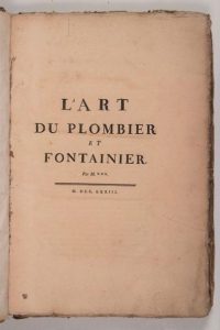 L'Art du plombier et fontainier. S.l. [Paris], L. F. Delatour, 1773. In-folio, cartonnage de papier marbré, non rogné (Reliure de l'époque). Édition originale de ce traité de plomberie faisant partie de la Descriptions des arts et métiers (1761-1789).