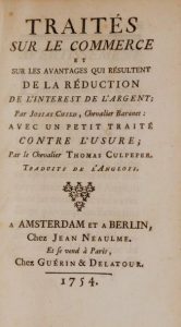 Traité sur le commerce et sur les avantages qui résultent de la réduction de l'interest de l'argent. Amsterdam et Berlin, Jean Neaulme ; Paris, Guérin et Delatour, 1754. In-12, veau marbré, dos orné, tranches rouges (Reliure de l'époque). Édition originale de la traduction de Vincent de Gournay.