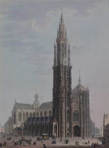 PETRUS JACOBUS GOETGHEBUER (1788–1866) (d'après)— 'Esterno del Tempio della SS Vergine cattedrale d'Anversa'. — Aquatinte. 445 x 330 mm (Blad: 575 x 380 mm)
