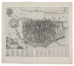 ■ (PLATTEGROND BLAEU) Een midden 17de–eeuwse gegraveerde plattegrond van de stad, uitgegeven in Blaeu's 'Stedeboek', ca. 1649. Rijkelijk versierd met wapens en Mercurius–figuur bij titelcartouche en onderaan plaatsaanduidingen. Brede marges.