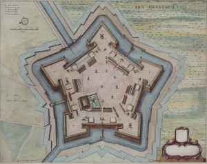 ■ (ANTWERPEN) — Een midden 17de–eeuwse gegraveerde en ingekleurde plattegrond van het Antwerpse Zuidkasteel, uitgegeven door De Wit.