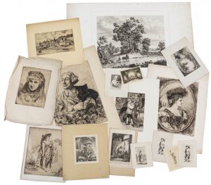 ■ Een gevarieerd lot gegraveerde portretten en landschappen, de meeste getekend in de plaat, sommige in potlood.