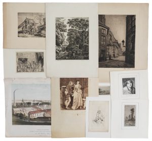 – Prints by Willem Geets (Couple in interior, etching, signed in ink, 260 x 190 (sheet: 550 x 320) mm, Charles Brias (1798–1884), Marius Bauer (1867–1932), etc.