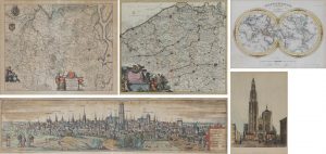 – Een laat 16de–eeuws gegraveerd panoramisch zicht op Mechelen uit Braun & Hogenbergs' 'Civitates Orbis Terrarum', vroeg 19de–eeuwse wereldkaart en een midden 19de–eeuwse litho met voorstelling van de Antwerpse kathedraal.
