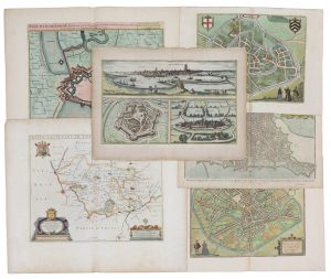 de 'Civitates Orbis Terrarum' de Braun & Hogenberg, 1581. 340 x 410 mm – 'Lira', un plan gravé de 'Liber Quartus Urbium Praecipuarum Totius Mundi' de Braun & Hogenberg, 1612. 320 x 400 mm – 'Ditio Casletana in comitatu Flandriae vulgo Cassel Ambacht', publié par Hendrik Hondius, ca. 1660. 390 x 490 mm – 'Plan d'Oudenarde', publié par Pieter Mortier, 1729. 370 x 480 mm – 'Ghent a large City and Castle in Flanders', plan par Bassire, 1721–1750. 390 x 480 mm Tot. : 6 ex.