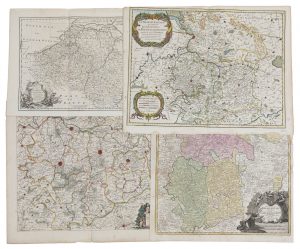 publiée par Hubert Jaillot, 1674. 440 x 575 mm – 2. une carte avec frontières coloriées de la région entre Malines et Bruxelles, titrée 'Pars Meridionalis Brabantiae continens dominium Mechliniense Ducatum Arschotanum' par Frederik De Wit, vers 1681–700. 460 x 545 mm – 3. une carte coloriée, titrée 'Ducatus Brabantiae nova Tabula' publiée dans 'Atlas maior' de Johan–Baptist Homann, vers 1740. 585 x 485 mm – 4. une carte gravée des Pays–Bas, titrée 'A new & correct map of the Netherlands or Low Countries' publiée par Eman Bowen, 1752. 355 x 430 mm Tot. : 4 ex.