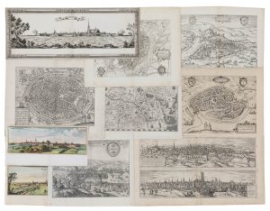– A lot of twe engraved and coloured views on Courtrai and Aalst by Johannes Peeters from 'Topographia circuli Burgundici' by Caspar Merian, 1654. 110 x 316 mm